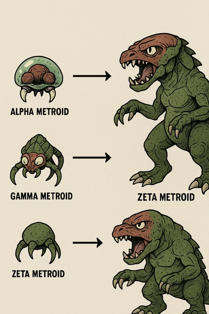 ตารางวิวัฒนาการ Metroid จาก Larva → Alpha → Gamma → Zeta → Omega ไม่ได้เป็นเพียงกลไกการเล่น แต่คือการเล่าเรื่องที่ทรงพลังที่สุดของซีรีส์ Metroid