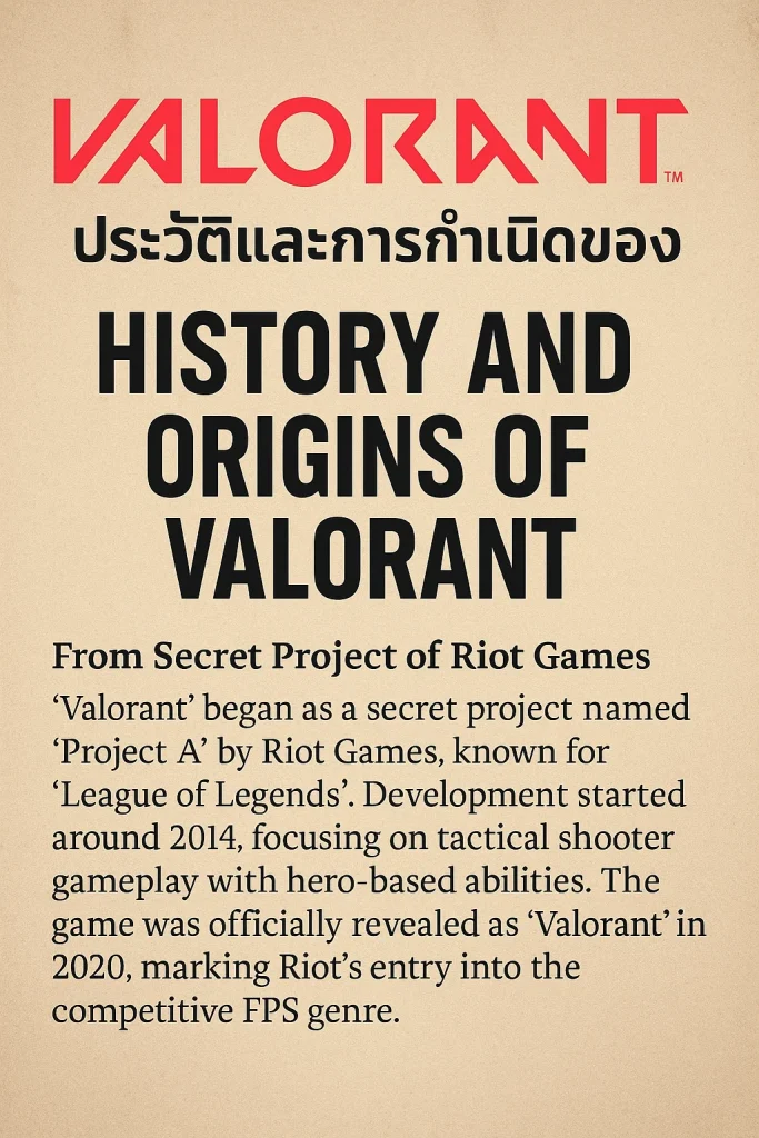 Valorant ถือกำเนิดจากโปรเจกต์ลับที่ Riot Games เก็บงำไว้นานนับปี ก่อนจะเปิดตัวและกลายเป็นหนึ่งในเกม FPS ที่ประสบความสำเร็จที่สุดในโลก ด้วยการผสมผสานระหว่าง ความแม่นยำแบบ CS:GO และ การใช้สกิลแบบ MOBA ทำให้เกมนี้มีเอกลักษณ์เฉพาะตัว