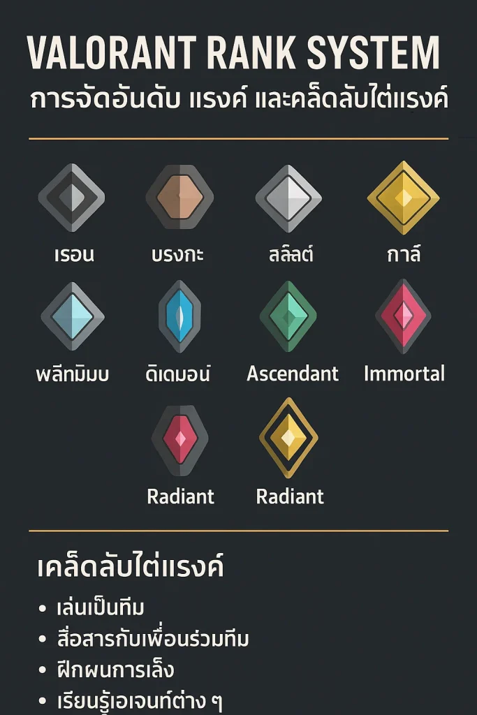 Valorant Rank System ไม่ได้เป็นแค่ตัวเลขบอกฝีมือ แต่เป็นการสะท้อนถึง การสื่อสาร, การทำงานเป็นทีม, และความพยายามฝึกฝน ของผู้เล่นแต่ละคน